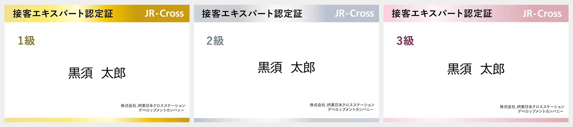 この「接客エキスパート制度」は、館内大会での審査結果に応じて3つの級に認定されます。この制度は、お客さまの期待に応えるだけでなく、「お客さまが気づいていないニーズを一緒に考え提案できる」、模範となるようなキャストを育てることを目的としています。1級認定者は金、2級認定者は銀のネームプレートを身に着け、接客エキスパートの誇りを胸に日々売場に立ち、お客さまを笑顔にしています。