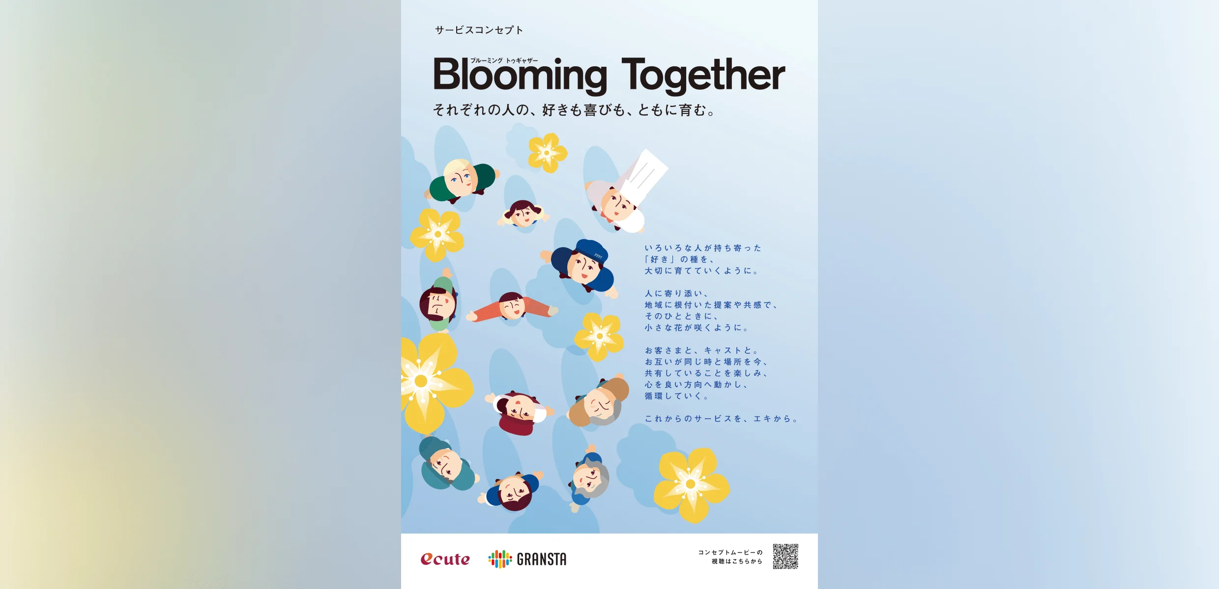 エキュートやグランスタが目指すサービスのカタチ、それが「Blooming Together(ブルーミング・トゥギャザー)」というサービスコンセプトです。これは単なる接客のスローガンではありません。「それぞれの人の、好きも喜びも、ともに育む。」という言葉の裏には、キャスト(従業員)とお客さま、そしてキャスト同士が「一緒に」「咲きつづける」ための温かい想いが込められています。